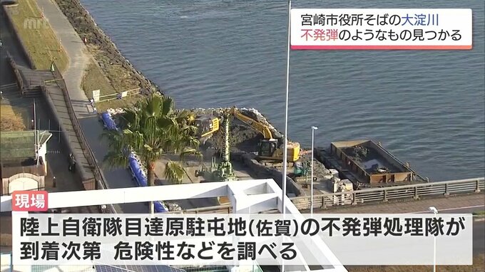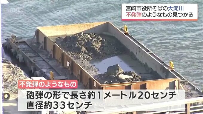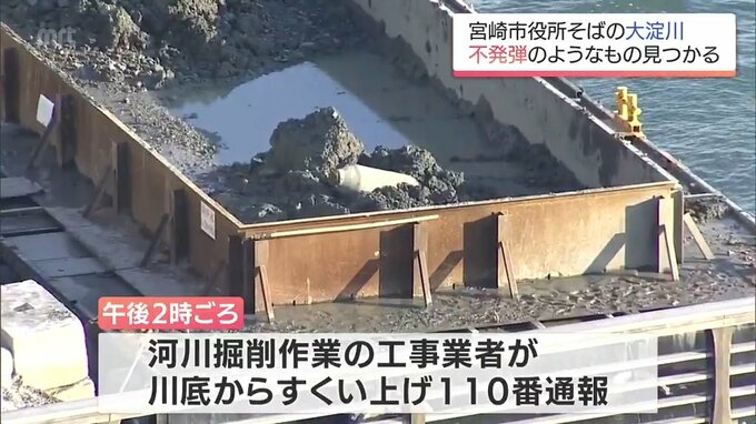 不発弾のようなものは宮崎市役所そばの大淀川で見つかり、5日午後2時ごろ、河川を掘削する作業にあたっていた工事業者が川底からすくい上げ、110番通報しました。
