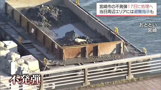 宮崎市役所近くの大淀川で見つかった不発弾 今月17日に処理へ 当日は半径400メートル以内の住民に避難呼びかけ 2026年1月7日(水) 19:00 国内 暮らし・マネー 5日に宮崎市の大淀川で発見された不発弾は、今月17日の午前11時から処理されることが決まりました。処理に伴い、現場からおおむね半径400メートル以内の住民には避難が呼びかけられます。5日、宮崎市役所近くの大…