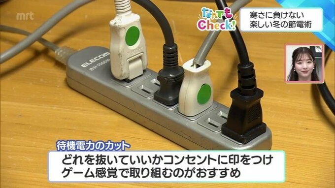 「スタンバイしている状態でも実は電気を使っています。どれを抜いていいか分かりやすいように、コンセントにシールなどで印をつけて、ゲーム感覚で取り組むのがおすすめです」