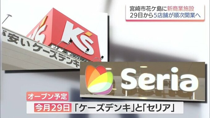 宮崎市花ヶ島に商業施設「クロスモール花ヶ島」が今月末に開業 宮崎市初出店のケーズデンキなどが順次オープンへ 2026年1月9日(金) 19:00 国内 暮らし・マネー 5店舗が順次開業 5つのテナントのうち、ケーズデンキと100円ショップのセリアが今月29日にオープン。 モール内で最も広い面積を占めるケーズデンキは宮崎市初出店です。