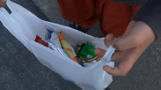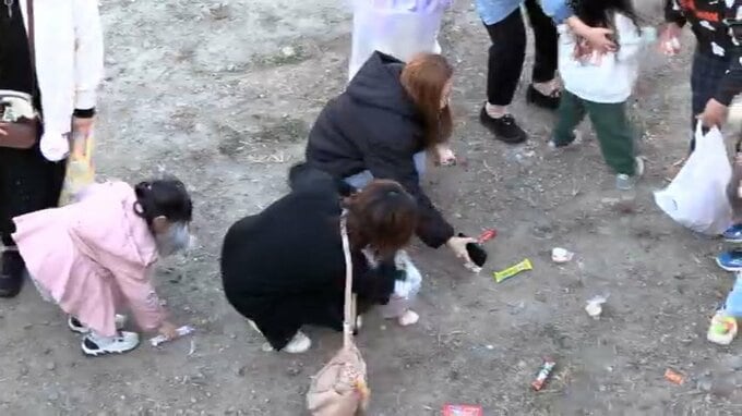 開始と同時に子どもも、大人も、おじいちゃん、おばあちゃんも、われを忘れたように拾い集める。帽子をかぶったこちらの男性は片手で3個取り。