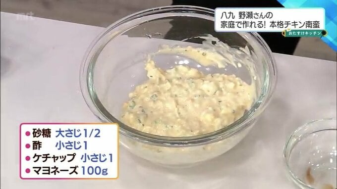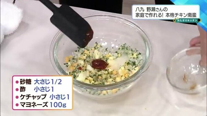 (4)残りの調味料(砂糖、酢、ケチャップ、マヨネーズ)を混ぜ合わせます。ケチャップを入れるのが「八九」流の隠し味です。