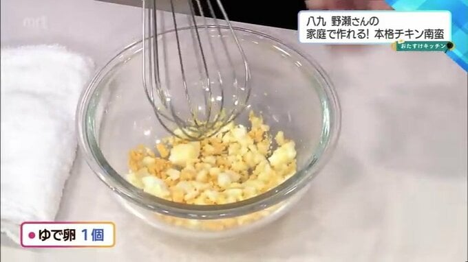 (1)ボウルにゆで卵を入れ、泡立て器などで食感が残るくらいに粗めに潰します。