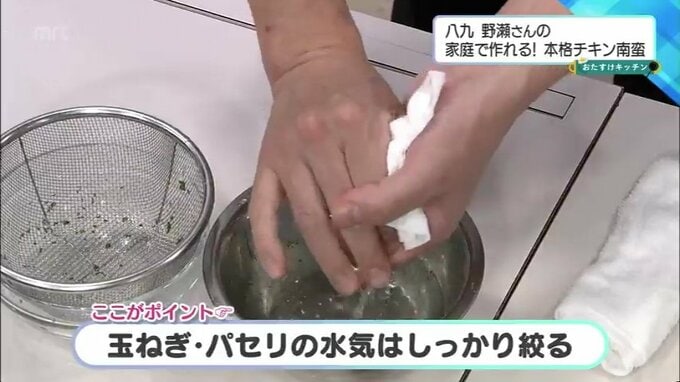 水にさらした玉ねぎとパセリをキッチンペーパーで包み、しっかりと水分を絞ります。