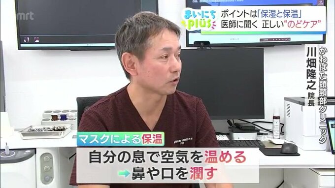 「マスク自体は(自分の息で)空気を温めるという作用があり、鼻のところ、もしくは、口のところを潤すという作用があるので、マスクは効果的だと思います。さらに、マスクの中に濡れたガーゼもしくは濡れた布を合わせて湿度を補充してやると、さらに加湿が効果的になります」