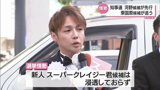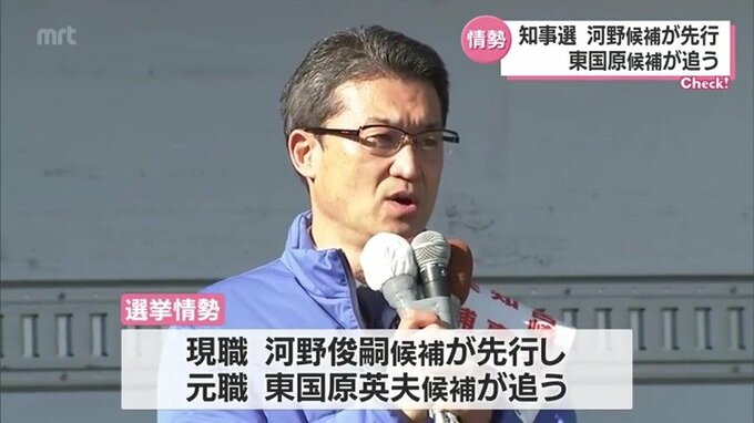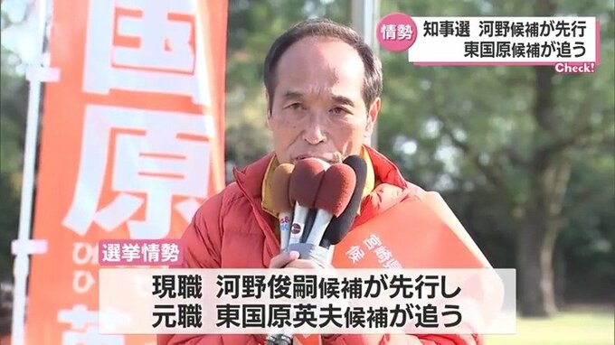 今のところ、現職の河野俊嗣氏が先行し、元職の東国原英夫氏が追う展開となっています。