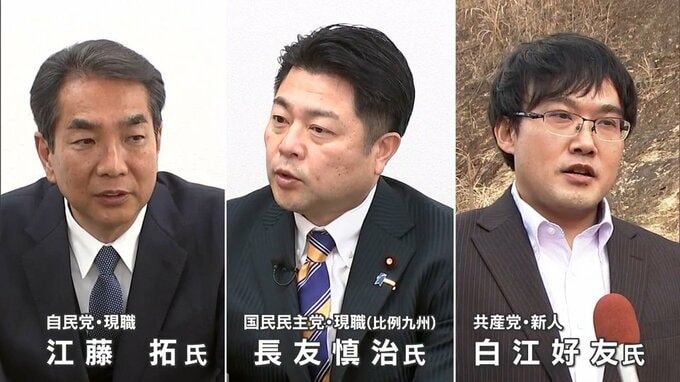 宮崎2区には、自民党・現職の江藤拓氏、国民民主党・現職の長友慎治氏、共産党・新人の白江好友氏の3人が立候補を予定しています。