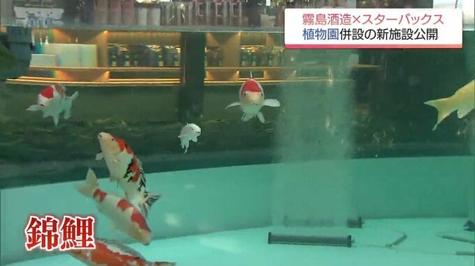 (渕雅顕記者)「店舗の横に併設された植物園ではドリンクも楽しめるんですが、見てください巨大な水槽に錦鯉がいるんです」