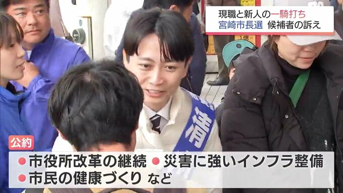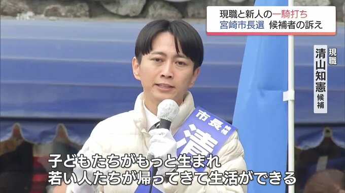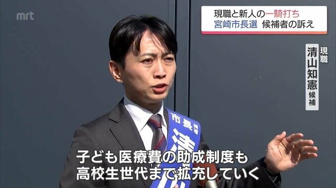 (現職・清山知憲候補)「子ども医療費の医療費助成制度も高校生世代まで拡充していく、さらに若い人たちが返さなければいけない奨学金、これ借金のようなものですけれども、これ宮崎市独自でその奨学金の返還支援を令和8年度からやっていくことができないか、そうしたことも考えている」