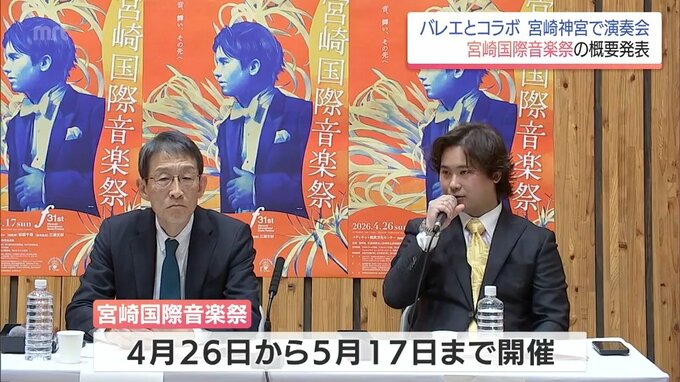 "音、舞い、その先へ" 31回目を迎える「宮崎国際音楽祭」の概要発表 バレエとのコラボレーションや宮崎神宮での演奏会なども 2026年1月27日(火) 17:09 国内 話題・グルメ 宮崎の春を彩る「宮崎国際音楽祭」の概要が発表されました。バレエとのコラボレーションや宮崎神宮での演奏会など、今年もさまざまなプログラムが予定されています。27日は県庁で河野知事と新たに総監督に就任した…
