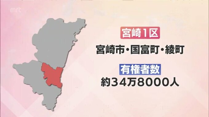 宮崎1区は、宮崎市、国富町、綾町の1市2町のエリアで、有権者の数はおよそ34万8000人となっています。