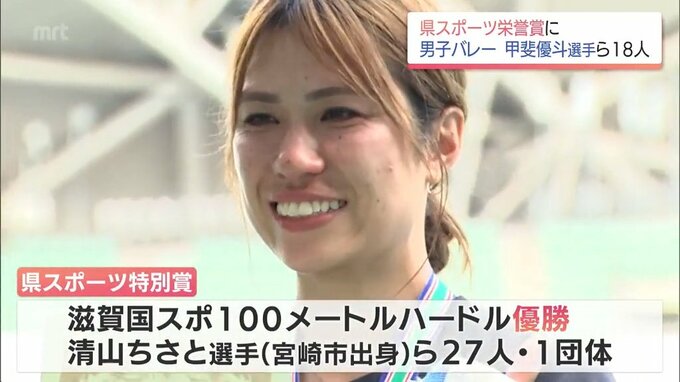 このほか、全国規模の大会で優勝した人などに贈られる県スポーツ特別賞には、滋賀国スポ100メートルハードルで優勝した宮崎市出身の清山ちさと選手など27人と1団体が選ばれました。