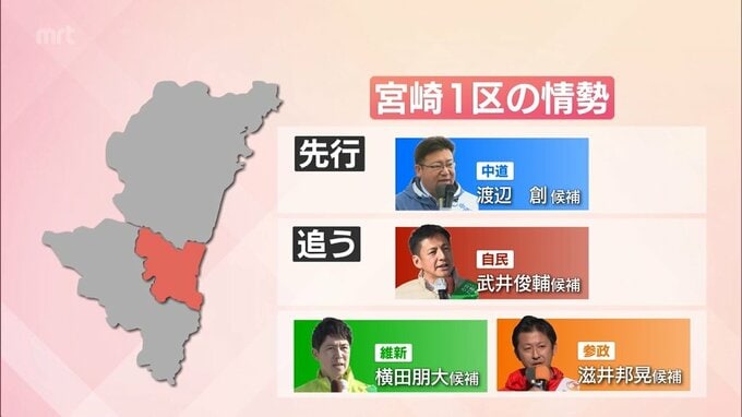 宮崎1区に立候補しているのは、届け出順に日本維新の会・新人の横田朋大氏、参政党・新人の滋井邦晃氏、自民党・元職の武井俊輔氏、中道改革連合・前職の渡辺創氏の4人です。