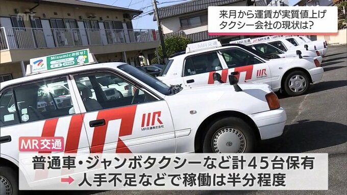 普通車のタクシーやジャンボタクシーなど45台を保有していますが、人手不足などの影響で実際に稼働している台数は半分程度です。