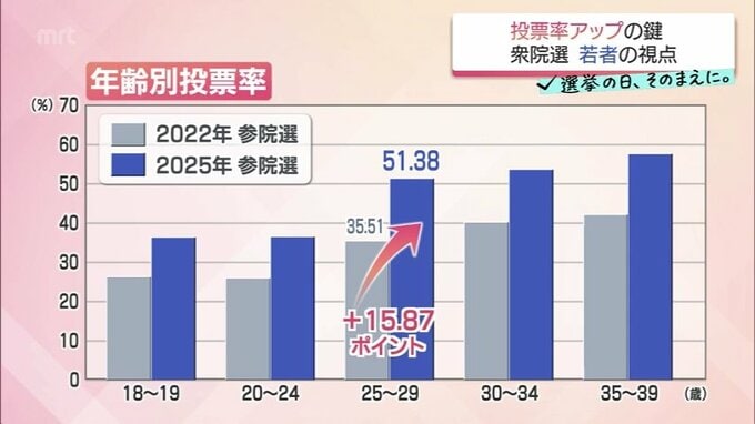 中でも、若者の投票率の伸びが目立ち、年齢別投票率では、20代後半が15.87ポイント増え、全体の投票率を引き上げました。