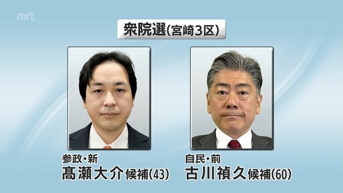 宮崎3区に立候補しているのは、届け出順に、参政党・新人の高瀬大介氏、自民党・前職の古川禎久氏の2人です。