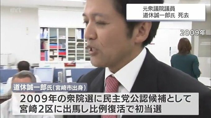 【訃報】元衆議院議員 道休誠一郎氏が死去 2026年2月4日(水) 19:01 国内 訃報です。宮崎県選出の元衆議院議員、道休誠一郎氏が、3日夜、亡くなりました。72歳でした。 道休氏は宮崎市出身で、2009年の衆院選に当時の民主党公認候補として宮崎2区に出馬し、比例復活で初当選。その後、当時の民進党県連の顧問を務めていました。