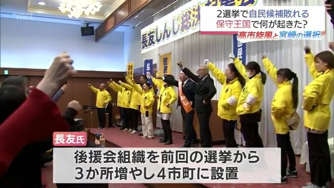 宮崎2区の長友氏は、去年1年間で60回にのぼる国政報告会や意見交換会を開催。さらに後援会組織も前回の選挙から3か所増やし、4つの市町に設けました。