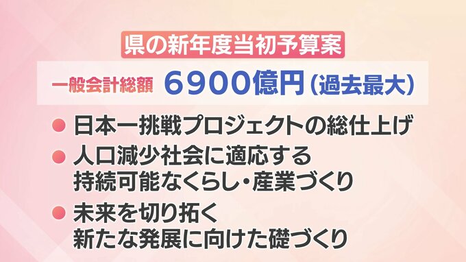 県の新年度当初予算案は、一般会計の総額が過去最大規模の6900億円で、「日本一挑戦プロジェクトの総仕上げ」、「人口減少社会に適応する持続可能なくらし・産業づくり」など3本柱で構成されています。