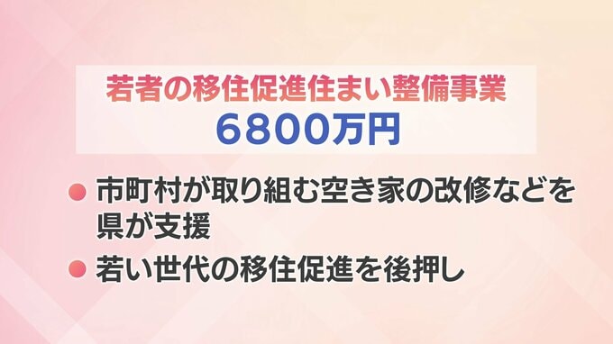 まずは、市町村が取り組む空き家の改修などを県が支援することで、若い世代の移住促進を後押しする事業があり、6800万円を計上しています。