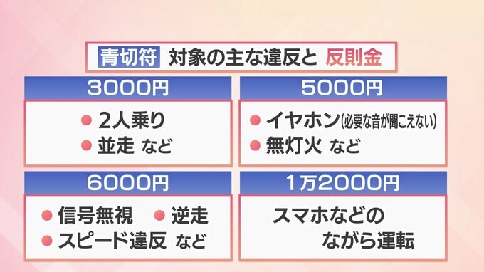 では、どのような違反が「青切符」の対象かというと、例えば、必要な音が聞こえない状態のイヤホン着用や無灯火は5000円、スマホなどの「ながら運転」は1万2000円となっています。