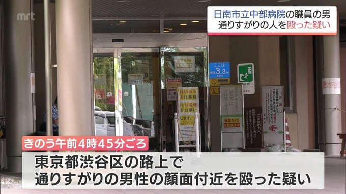 3日未明、日南市立中部病院の職員の男が東京都渋谷区の路上で通りすがりの男性の顔付近を殴った疑いで逮捕されました。