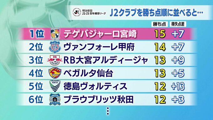 8月からはJ2のみのリーグが開幕しますが、今4つのリーグに分かれて特別大会を戦っているJ2クラブを勝ち点順に並べるとこうなります。