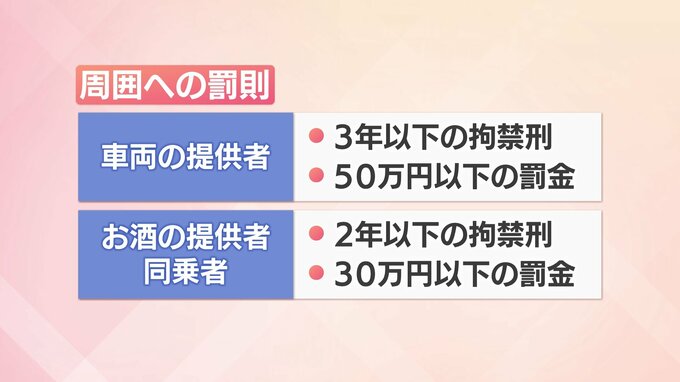 「車両の提供者」には運転者と同じ3年以下の拘禁刑などが、「お酒の提供者」や「同乗者」にも、2年以下の拘禁刑などが科されるおそれがあります。