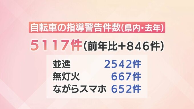 去年、県内の自転車の指導警告件数は、前の年より846件多い5117件で、内訳は並進が2542件、無灯火が667件、ながらスマホが652件となっています。
