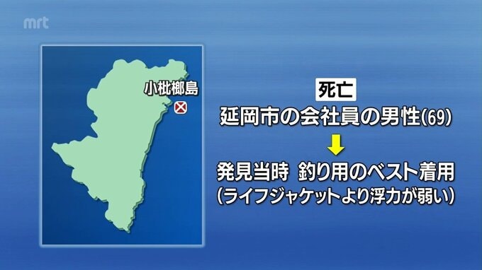 溺れたのは延岡市に住む会社員の69歳の男性で、海に浮いている状態で見つかり、遊漁船の船長が船に引き揚げて病院に運ばれましたが、その後、死亡が確認されました。