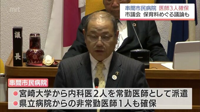 串間市民病院 4月から「8人体制」確保へ 保育料の完全無償化も「継続」決まる 2026年3月18日(水) 19:00 国内 医師不足が深刻な串間市民病院についてです。武田市長は、常勤と非常勤の医師あわせて3人を新たに確保し、来月から8人体制で診療にあたると議会で報告しました。串間市民病院では、常勤医師7人のうち2人が今月末で…