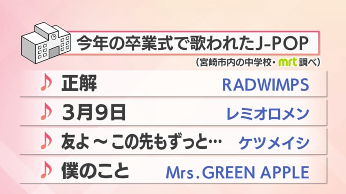特に中学校や高校で増えているJ-POPですが、MRTが宮崎市内10の中学校に取材したところ、今年は6校で採用されていて、下記の通りの楽曲となっています。