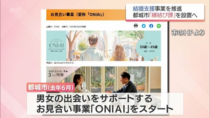 都城市が「縁結び課」を新設 市の結婚支援事業をさらに推進へ 2026年3月25日(水) 17:34 国内 結婚支援事業をさらに推進しようと、宮崎県都城市は、来年度、「縁結び課」を新設すると発表しました。都城市は、去年6月、結婚を希望する男女の出会いをサポートするお見合い事業「ONIAI(おにあい)」をスタート…