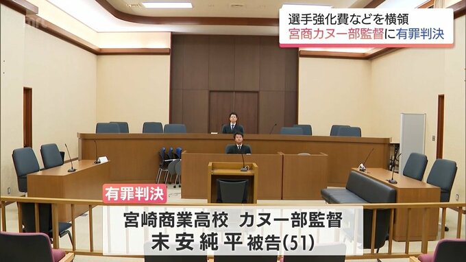 宮崎商業高校カヌー部監督に懲役1年6か月の判決 「信頼揺るがす」補助金横領で免職 2026年3月27日(金) 19:00 国内 選手の強化費などのための補助金を私的な支払いにあてたとして、横領の罪に問われていた宮崎商業高校カヌー部の監督に、宮崎地裁は懲役1年6か月執行猶予3年の有罪判決を言い渡しました。判決を受けたのは、宮崎商…