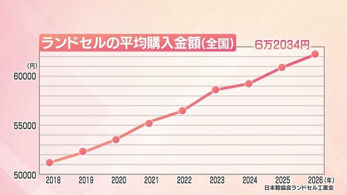 また、ランドセルの平均価格は年々上がる傾向にあり、この春の平均価格は6万2000円を超えています。