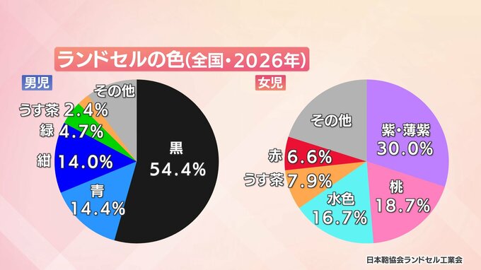 色については、男の子向けは2022年以降、黒の割合が6割を下回っていて、女の子はさらに色の多様化が進んでいて、好きな色を選ぶ傾向が高まっているということです。