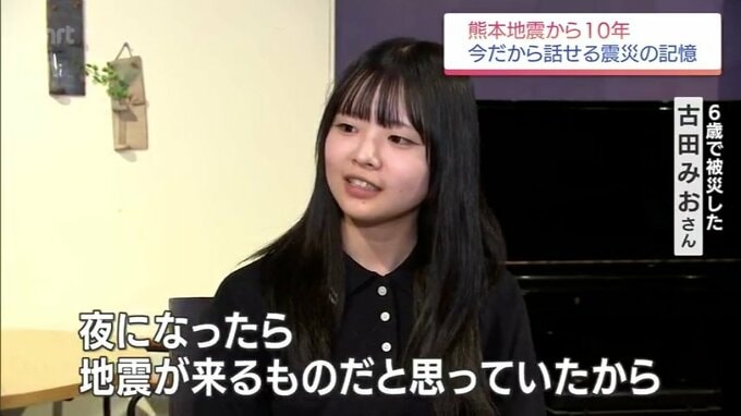 「本震の時に寝ていたらお父さんが来て守るじゃないけど、してくれたのしか覚えていない。夜になったら地震が来るものだと思っていたから、夜になるのが怖い。だから、夜は家に入りたくない(と思っていた)」