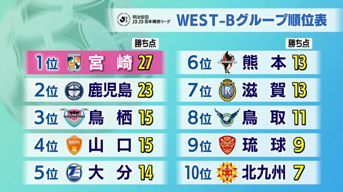 J2・J3百年構想リーグWEST-Bグループ、テゲバジャーロ宮崎は2位の鹿児島に勝ち点4の差をつけ、単独首位となっています。