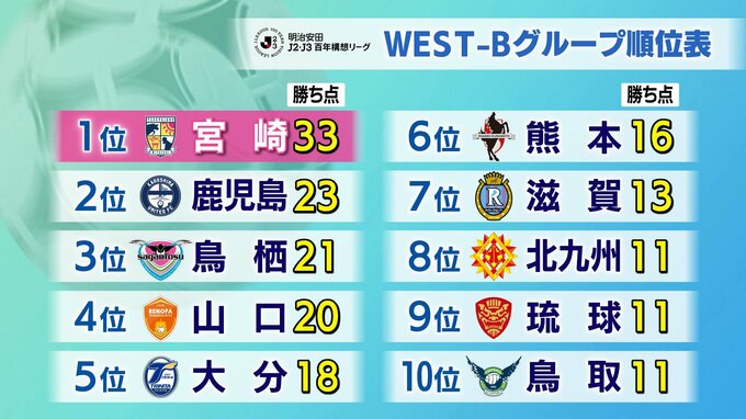 この試合で、2位、鹿児島との勝ち点は10点差となりました。