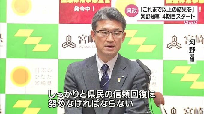 「県民の皆さまの信頼回復に努めていかなくてはならない」河野俊嗣宮崎県知事 4期目スタート 2023年1月23日(月) 18:55 国内 先月の宮崎県知事選挙で当選を果たした河野知事の4期目の任期がスタートしました。河野知事は「これまで以上の結果を出さなくてはならない」と意気込みを述べました。(宮崎県 河野俊嗣知事)「強い緊張感のもとで…