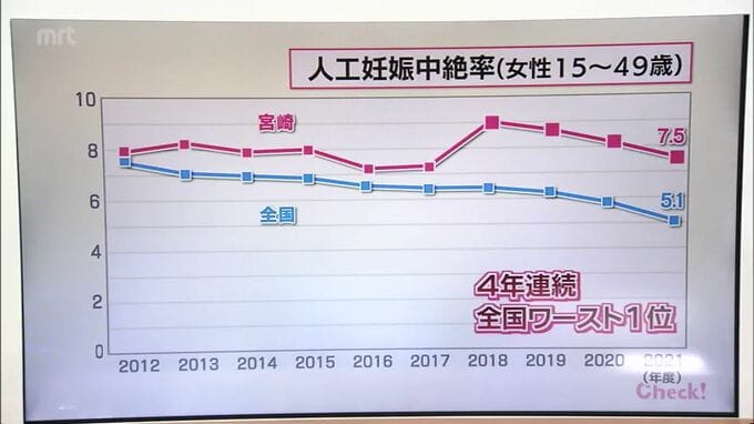 2021年度の宮崎県内の15歳から49歳までの女性の人口1000人当たりの人工妊娠中絶率は7.5と4年連続で全国ワースト1位となっています。