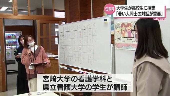 宮崎大学の看護学科と県立看護大学の学生が講師となり、高校1年生に性教育の授業しました。