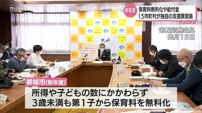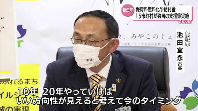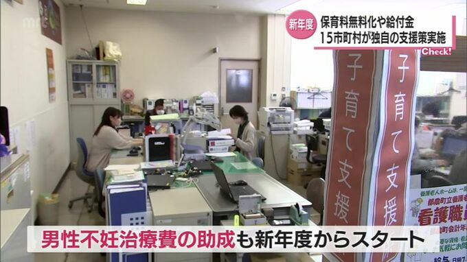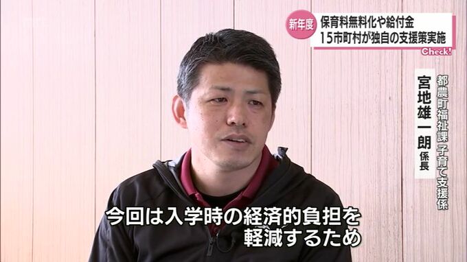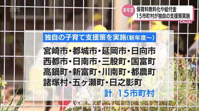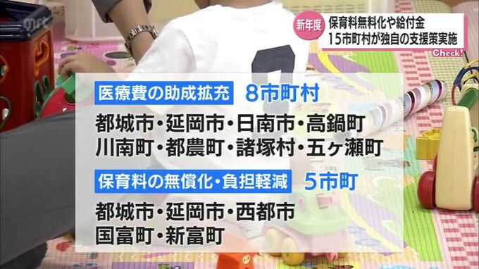 MRTの取材によりますと、新年度から、独自の子育て支援策を実施する自治体は、西都市や高鍋町など、15市町村。全市町村の半数以上に上ります。