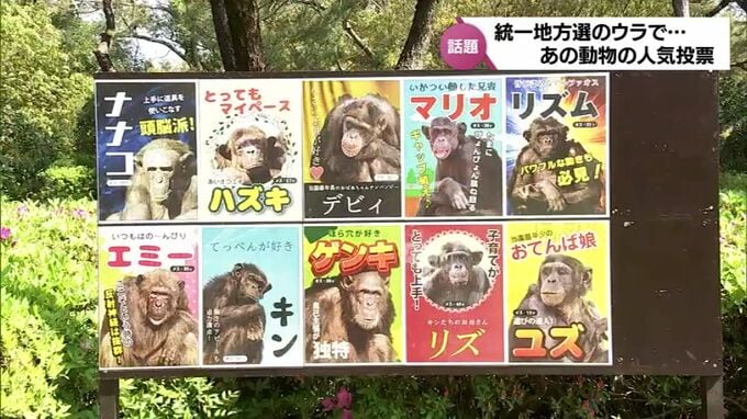 あの“雑巾がけ”のチンパンジーはどうだった?統一地方選のウラで宮崎市の動物園では「チンパンジー総選挙」 2023年4月3日(月) 18:30 国内 宮崎県内では、現在、県議選が繰り広げられていますが、そのウラで、とある選挙が行われ話題になっています。その選挙の舞台は動物園。ある動物の人気投票の結果が発表されました。こちらは、宮崎市フェニックス自…