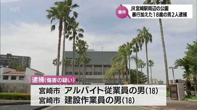 JR宮崎駅周辺の公園にSNSで男性を呼び出し 因縁をつけて暴行 18歳の男2人が傷害の疑いで逮捕 2023年6月9日(金) 19:00 国内 JR宮崎駅周辺でまた事件です。SNSで男性を呼び出し、因縁をつけて暴行を加えたとして、18歳の男2人が逮捕されました。傷害の疑いで逮捕されたのは、宮崎市に住むアルバイト従業員の18歳の男と、宮崎市の建設作業員…