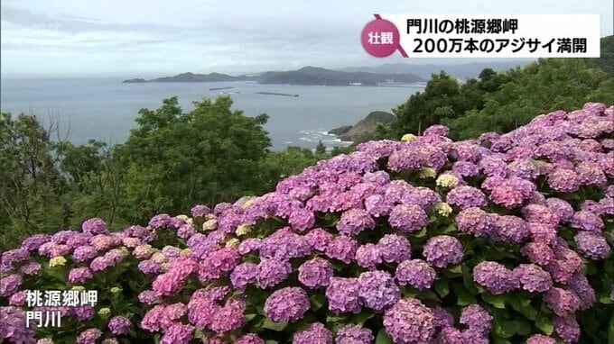 約200万本のアジサイが満開に 門川町の「桃源郷岬」 2023年6月13日(火) 19:00 国内 話題・グルメ 宮崎県門川町にある私設庭園「桃源郷岬」で、200万本のアジサイが満開となっています。門川町の遠見半島にある私設庭園の桃源郷岬。20万平方メートルの敷地におよそ100種類200万本のアジサイが咲き誇り、現在、満…