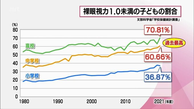 文部科学省によりますと、2021年度、視力が裸眼で1.0を下回る人の割合は高校が70%、中学校は60%でいずれも過去最高となりました。
