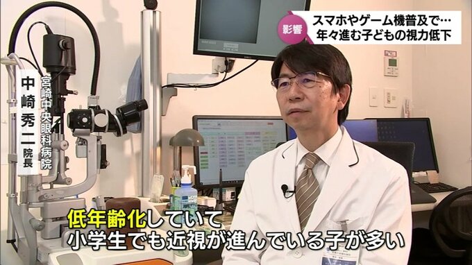 (宮崎中央眼科病院・中崎秀二院長)「以前は(近視が)中高生に多かったが、低年齢化していて小学生でも近視が進んでいる子が多い」