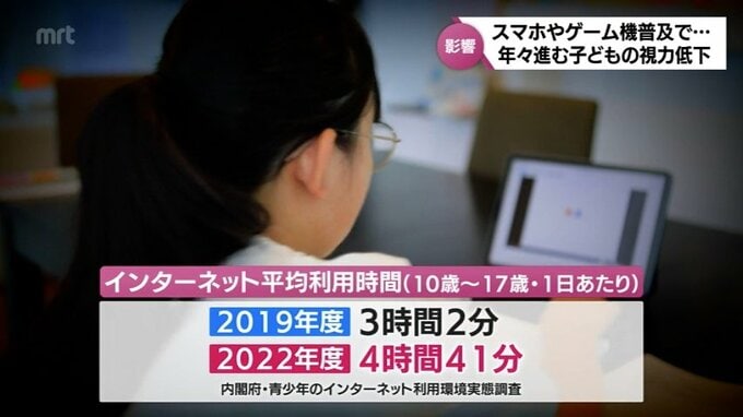 (宮崎中央眼科病院・中崎秀二院長)「以前に比べると屋外で活動する時間よりも室内でずっとスマホを見たりテレビ・本を見る時間が多くなっていますので、やはりそれは影響がある」