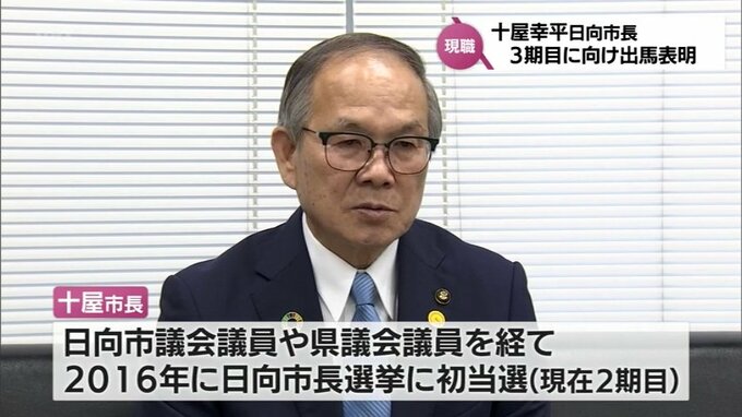 来年3月の日向市長選挙 現職・十屋幸平市長が立候補を表明 2023年6月21日(水) 19:00 国内 任期満了に伴う来年3月の宮崎県日向市長選挙に向けた動きです。現職の十屋幸平市長が、3期目を目指し立候補を表明しました。(日向市 十屋幸平市長)「引き続き市政の運営を担わせていただきたいと強い決意を固め…